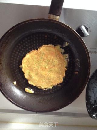 6. 用勺子将面糊和角瓜鸡蛋液倒入锅中,摊成饼状。